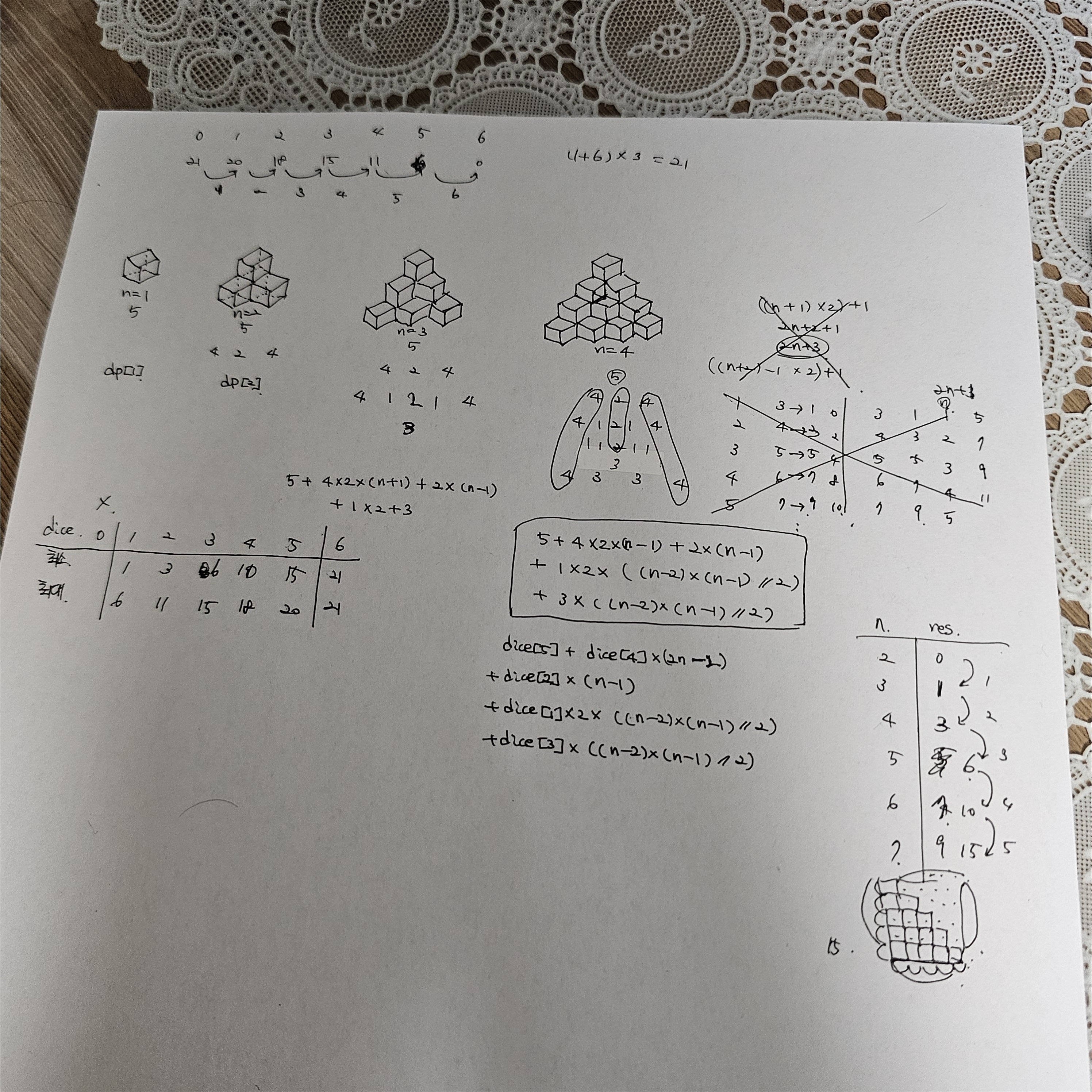 N이 2인 경우, 맨 위층 DP[1]에 더해, 아래 층인 양 끝 4개 면이 보이는 두 개의 주사위와 가운데에 있는 두 개 면이 드러난 한 개의 주사위가 있을 것이다.